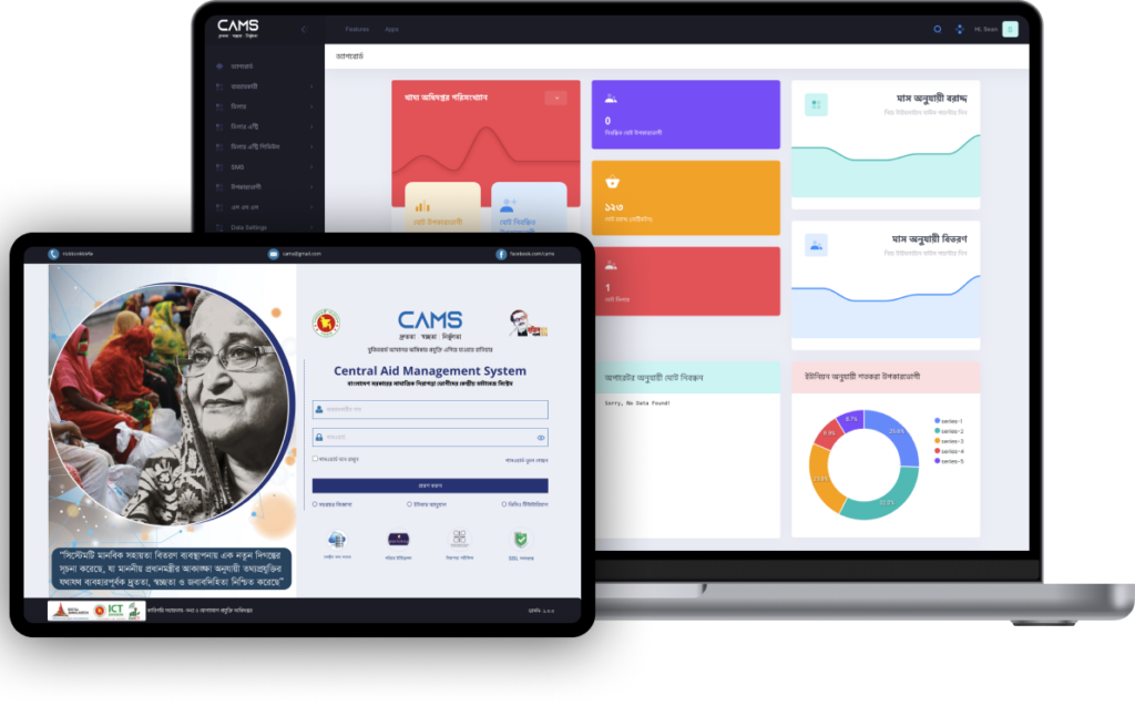 CAMS is an aid management software built for 29 ministries of the Bangladesh Government under the monitoring of the Department of ICT from the ICT Ministry of Bangladesh to manage each ministry’s aid distribution program. This complex software has two major parts: A backend system for the government administrators at different levels with access control, and a mobile application to work on the field for real-time aid distribution.