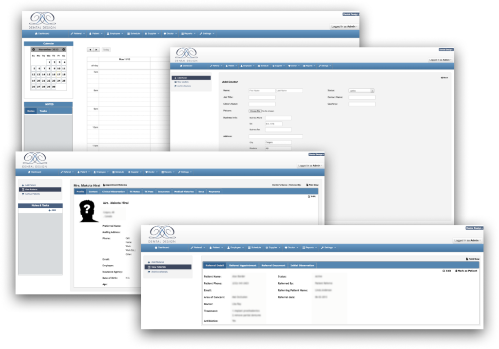 Dental Design system efficiently manages patient records, referrals, and appointments, linking patients to doctors and streamlining staff tasks. It incorporates supplier management, scheduling, and advanced reporting, providing an all-in-one solution for modern dental practices.