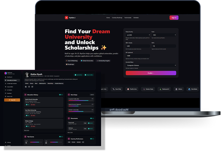 Ryogen AI is an advanced admission consultancy platform that leverages artificial intelligence to empower students worldwide in making smarter, data-driven decisions about their higher education journey. Using predictive AI models trained on global admission trends, academic performance data, and student profiles, Ryogen delivers personalized university predictions across 8 major study destinations—helping students maximize their chances of acceptance with precision and confidence..