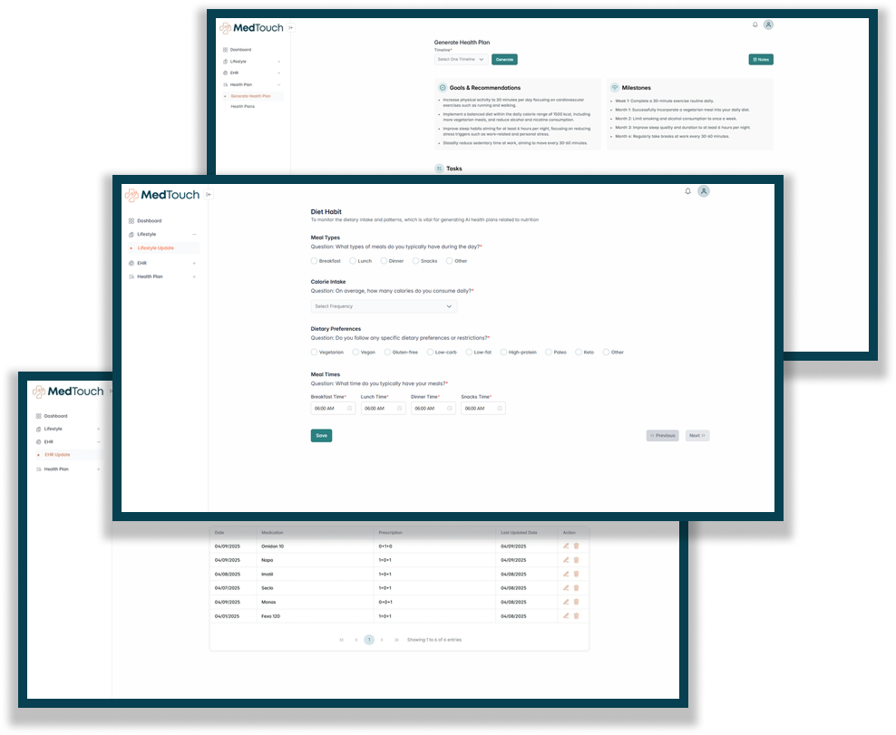 MedTouch is an AI-powered healthcare platform that bridges the gap between patients and General Practitioners (GPs). By applying advanced artificial intelligence to Electronic Health Records (EHRs) and lifestyle data, MedTouch generates dynamic, personalized health plans tailored to each patient’s unique journey. The AI sets actionable goals, predicts potential risks, and continuously adapts recommendations—empowering patients to stay proactive while enabling GPs to deliver precise, data-driven, and continuous care.